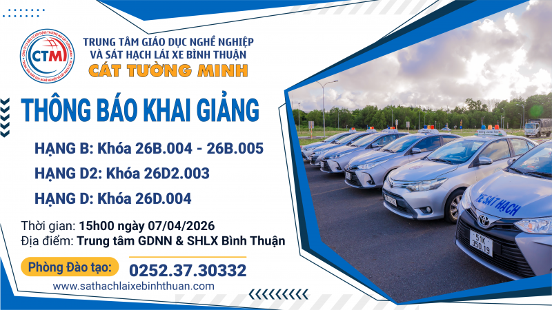 Kính mời quý Học Viên các khóa trên vào lúc 15h00 ngày 0704/2026, có mặt tại Trung tâm GDNN và SHLX Bình Thuận - Cát Tường Minh để khai giảng lớp học.