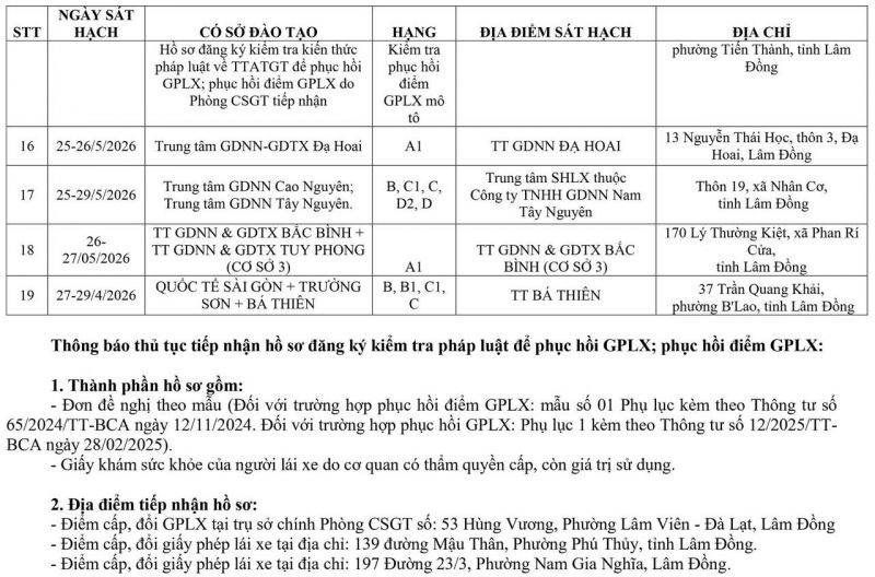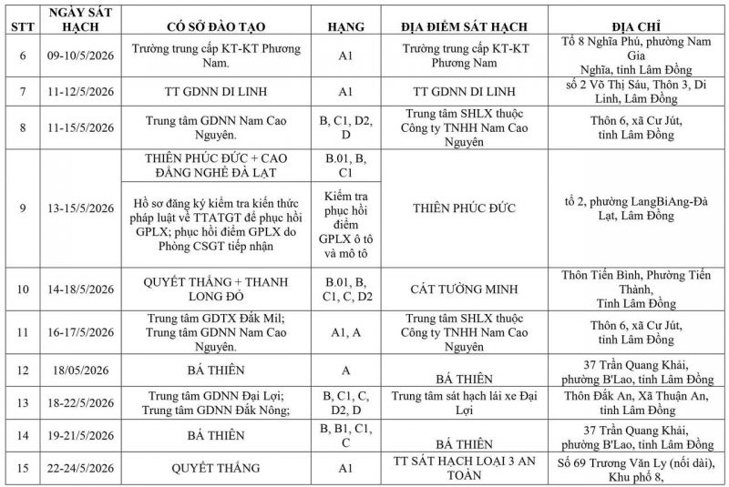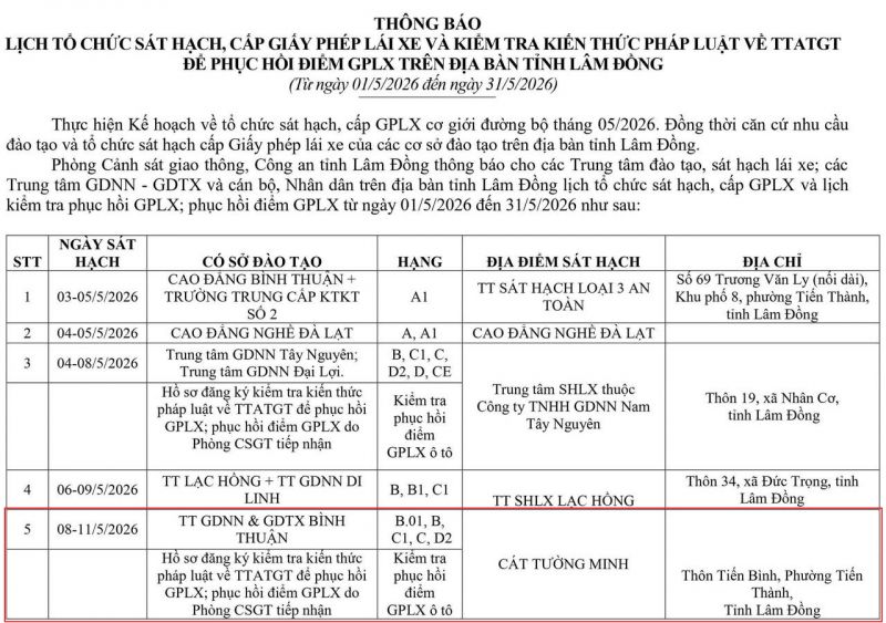 THÔNG BÁO LỊCH TỔ CHỨC SÁT HẠCH CẤP GIẤY PHÉP LÁI XE TRÊN ĐỊA BÀN TỈNH LÂM ĐỒNG THÁNG 05 NĂM 2026